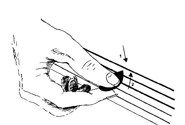 Beim Zupfen bedient der Daumen die E-, A- und D-Saite, während der Zeigefinger die g-Saite, der Mittelfinger die h-Saite und der Ringfinger die e-Saite spielt. Ausnahmen bestätigen die Regel, weil jeder Gitarrist sich seine eigene Technik draufschafft.