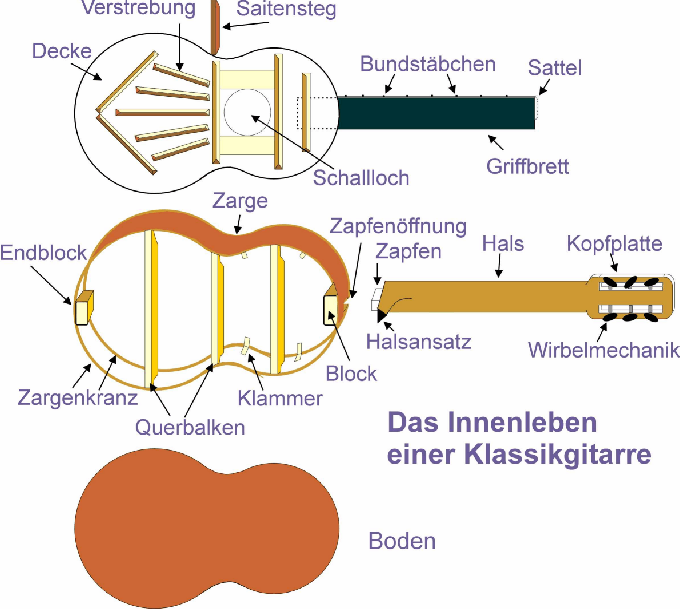 durch den Druck der Saiten auf den Korpus festgehalten wird. Das